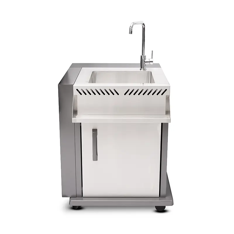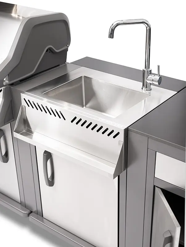 יחידת כיור אלגנטית הכוללת ברז איכותי, ניקוז וארון אחסון – פתרון מושלם לשטיפת ירקות, כלים והכנת מזון כחלק ממטבח החוץ המלא שלך.