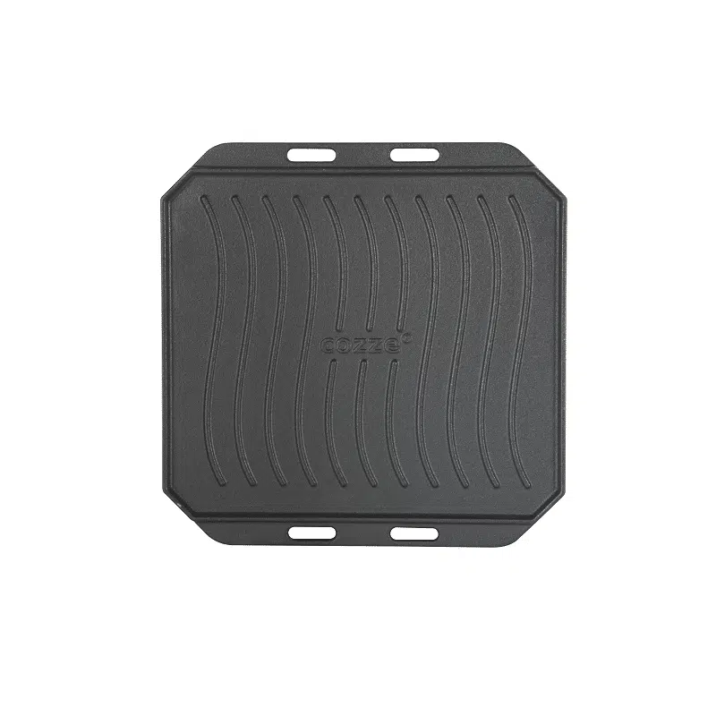 מחבת ברזל יצוק Cozze דו צדדית עם צד חלק וצד פסים, ידית נשלפת נוחה ומגש עץ בוק איכותי. אידאלית לצלייה, טיגון והגשה מושלמת של מגוון מנות.