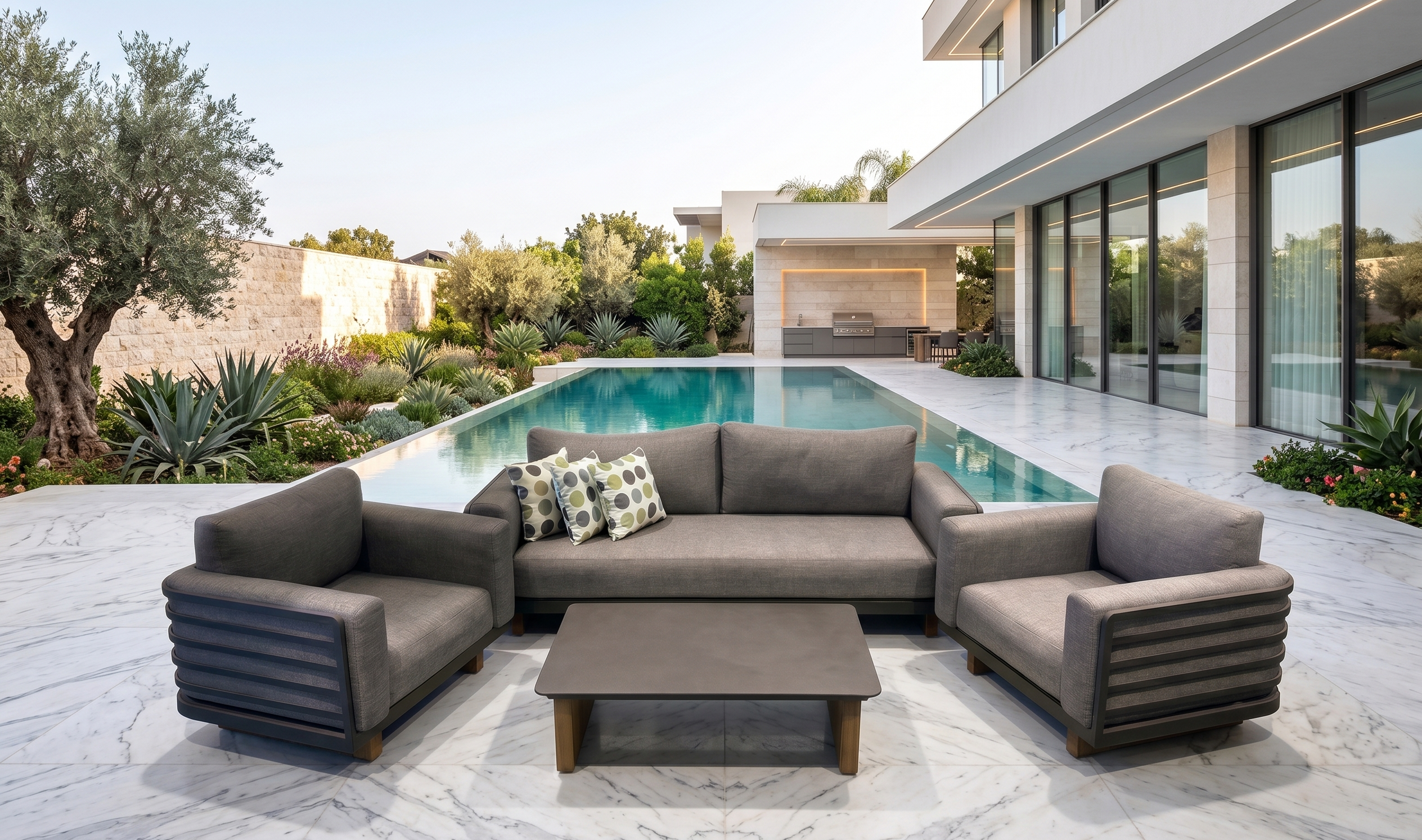 פינת ישיבה אלומיניום MOKA – סט ספות אלומיניום 4 חלקים יוקרתי למרפסת או לגינה. כולל ספה תלת, 2 ספות יחיד ושולחן קפה. כריות אוליפן עמידות למים, רגלי אלומיניום במראה עץ טיק.