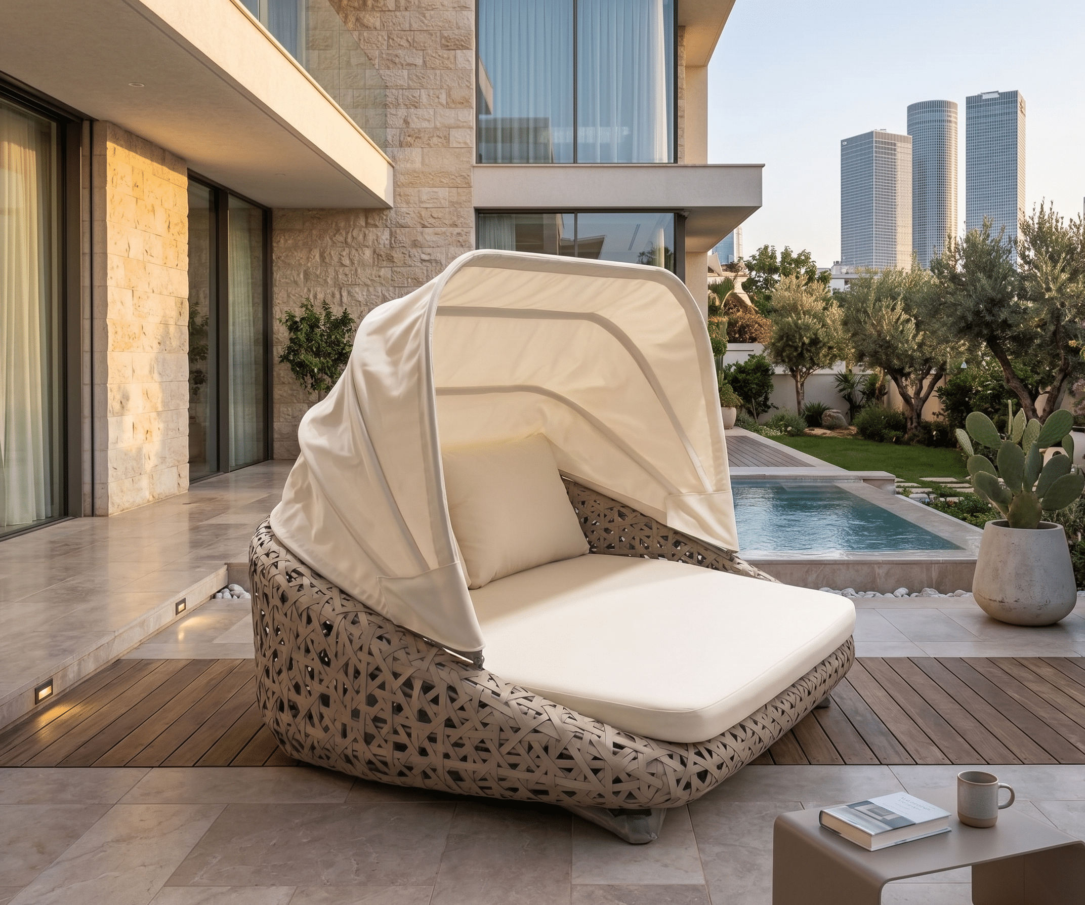 המזרן וכריות הנוי עשויות בד איכותי בצבע אפור הניתן לכיבוס, בגימור רוכסן לשליפה מהירה ופשוטה עובי מזרון 12 ס"מהקונכיה כוללת גגון בד מתכוונן 4 זרועות עם בוכנה פנאומטית (הצללה של כ – 65% משטח הקונכיה), הניתן להסטה בקלות, כמו כן, ניתן לעגן את הגגון לקונכיה ע"י תופסן בד/סקוצ'.